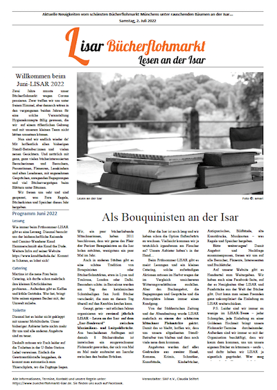 Der Sommer-LISAR 2022 ist schon fast wieder eine Woche vorbei – wir danken allen, die uns trotz der beiden Corona-Jahre die Treue gehalten haben und 2022 wieder ihre Stände am Isarufer aufgebaut haben – schön dass ich so viele bekannte Gesichter gesehen habe und so viele positive Kommentare gehört. Wir danken ebenso allen neuen Verkäufern und natürlich auch all unseren Besuchern und Buchkäufern! Der ganze Isarboulevard an der Widenmayerstraße endlich wieder voller interessanter Bücher, großartig!