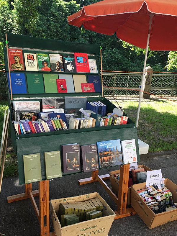 Gesagt, getan – seit etlichen Jahren organisieren wir zweimal jährlich LISAR – Lesen an der Isar auf dem „Isar-Boulevard“ zwischen Maximilians- und Luitpoldbrücke. Aus bescheidenen Anfängen mit damals 8 Bücherständen ist inzwischen ein ausgewachsener Flohmarkt geworden, der sich von Mal zu mal mehr ausbreitet am Isarufer zwischen den beiden Brücken. Aber die Isar ist ja noch lang und wir haben schon die Option flußaufwärts zu wachsen. Vielleicht kommen wir ja tatsächlich irgendwann am Flaucher an? Unsere Anbieter haben’s in der Hand…